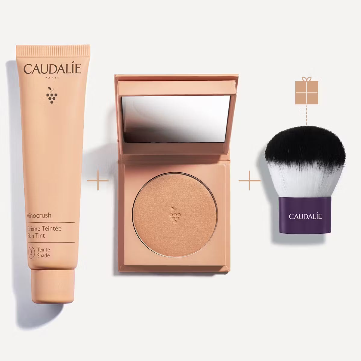 Retrouvez la CC Crème teinte 3, la Poudre Bronzante Longue Tenue et en cadeau : un pinceau Kabuki offert dans notre trio Vinocrush.